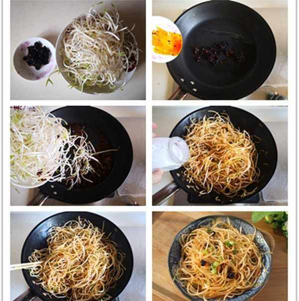 小貼士:1. 先將香辣豆豉醬煸炒出香味,激發其鮮味; 2. 加入綠豆芽進鍋後要大火快速翻炒,避免營養的流失。