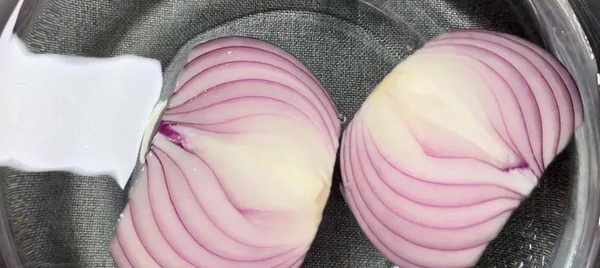 1.首先準備一個新鮮的紫皮洋蔥,將表面老一點的洋蔥皮撕掉,再用刀切去頭尾,然後對半切開,放入食鹽水中浸泡5分鐘,這樣可以很好地去除洋蔥的刺激性氣質,切的時候就不會流眼淚瞭。