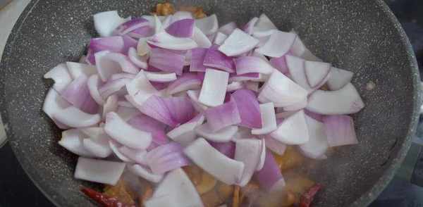 4.倒入洋蔥,開大火不停翻炒,將洋蔥炒斷生,炒洋蔥的時候千萬不要先放鹽,過早放鹽會導致洋蔥出水,炒出來的洋蔥軟趴趴的不好吃。