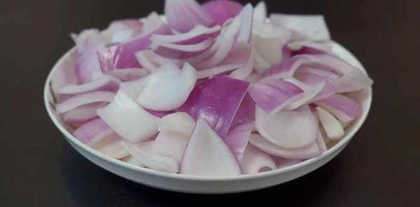 1.首先準備2個洋蔥,將外面的老皮剝掉後,用刀切去頭尾,再對半切開,改刀切成小塊,用手抓散裝入盤中備用。