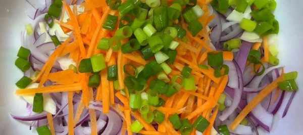 3.接著切一些配菜,大蒜切薄片,厚度和洋蔥差不多,我這裡切瞭有8顆左右,大傢可以根據個人喜好自行調整,接著再切一些胡蘿卜,胡蘿卜先切薄片,再改刀切細絲,胡蘿卜不僅可以搭配顏色,還可以豐富口感,再切一些蔥花,全部切好放到洋蔥上。