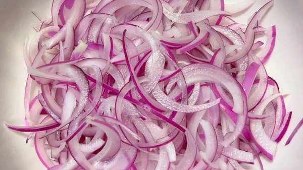 2.5分鐘後,將洋蔥從水裡撈出,用清水將洋蔥表面多餘的鹽分沖掉,再用刀切成細絲,切得越薄就越入味越好吃,全部切好抖散開,裝入碗中備用。