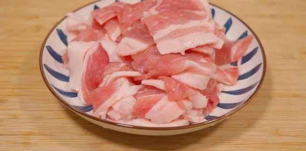 2.炒洋蔥最少不瞭的就是五花肉,準備一塊去皮的五花肉切成薄片,盡量切薄一些。