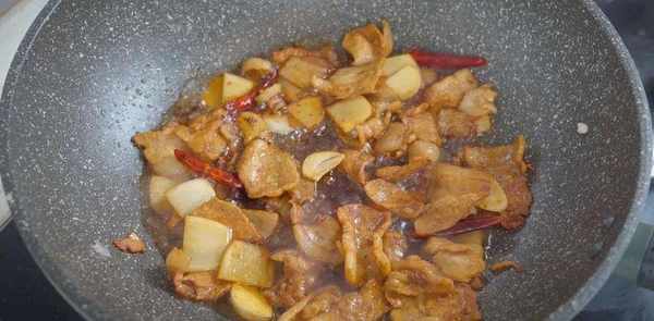 3.起鍋倒食用油,油熱下入五花肉開小火煸炒,將多餘的油脂炒出,五花肉炒香後,下入少許老抽給肉片上色,再倒入幹辣椒和薑蒜片,開中火爆出香味,再加入一勺料酒去腥增香。