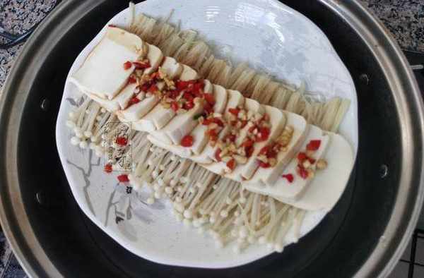 2.第二步,蒸制豆腐和金針菇。
