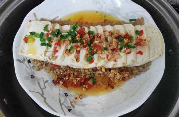 蒸制的時不要開大火,用中小火蒸制,大傢如果看到鍋中的金針菇變黃,豆腐邊緣逐漸成型,我們便可以開鍋,為其撒上蔥花增色,如此一來,我們的豆腐蒸金針菇便做好瞭。