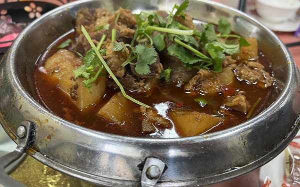終於是看到一個大菜瞭,蘿卜燉牛腩,這個菜還是可以的,隻不過肉比較少,基本上都是白蘿卜,這個也是用大鍋煮好的,然後每一桌打上一點,口感相對來講也並不是特別好,看著相對比較的油膩,而且味道也比較咸瞭。
