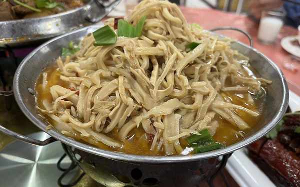 這可是江西贛北地區的名菜瞭,選用的是竹筍,切的比較細的那種,經過浸泡壓爛,然後再來炒,接著上菜的時候,還會來上一個小酒精爐子,一邊燉一邊吃,這個菜說句實在話,成本是極低的,因為江西基本上每個地區都不缺少筍子,這算是很廉價的菜瞭。