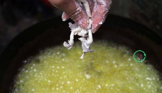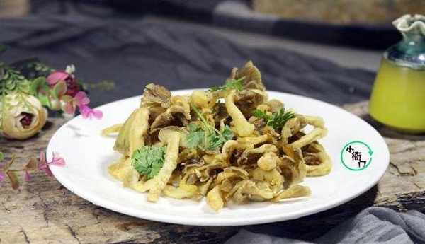4.鍋裡放入多點豆油,燒熱之後放入拌好的蘑菇大火炸個50秒就成型瞭!豆油是金黃色的,炸東西很上色炒菜也很漂亮,但是豆子的生味兒很大,豆油必須先“熟油”才可以吃。熟油的時候,鍋裡放上一顆大蔥或者大料都可以。