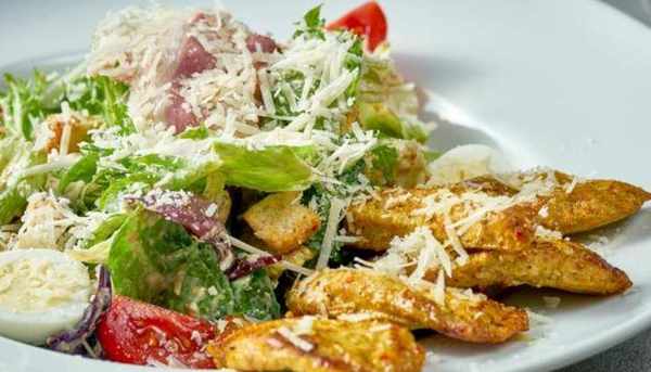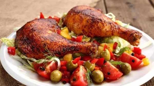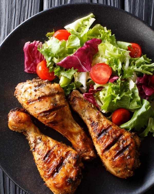 材料:雞腿2個;沙拉菜適量;西紅柿1個;黃瓜1個;橄欖油適量;檸檬汁適量;鹽、黑胡椒適量
