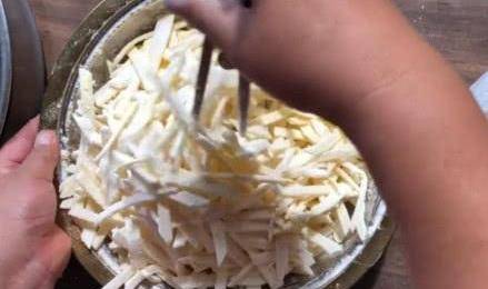 在制作美味土豆新吃法之前,首先準備一個土豆,把土豆去掉土豆皮清洗幹凈切成土豆絲狀,放入一個幹凈的盆中,接著碗盆裡倒入沒過土豆絲的清水,將土豆絲浸泡30分鐘,之後撈出控一下水備用。