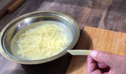 溫馨提示:土豆條一定要放入清水中,浸泡半個小時,那樣再拿來制作的時候就不容易炒斷,更加美味瞭。