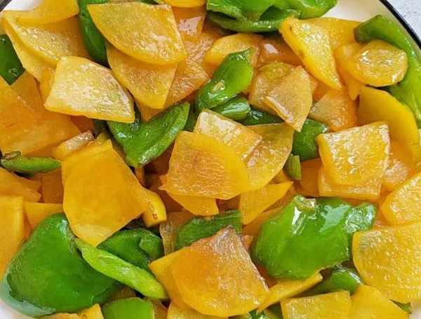 ①青椒洗凈去籽,土豆洗凈去皮切片