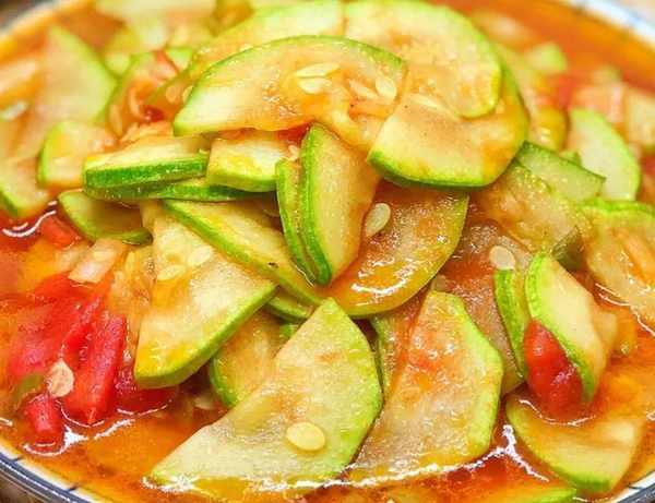 ②鍋中放入適量油,放入蔥薑蒜爆香,倒入番茄翻炒出汁,加入西葫蘆加適量水翻炒變色