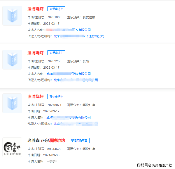 淄博燒烤因網友種草而紅,並在網友持續接力打卡中持續火爆。從天眼查瞭解到,“淄博燒烤”有關已被多傢公司及個人申請註冊商標,申請人包括淄博某源環境衛生服務有限公司、威海某潤農業科技股份有限公司,申請時間多數為3月中旬。申請的國際分類涉及方便食品、廣告銷售、餐飲住宿等,當前商標狀態多為申請中或等待實質審查。