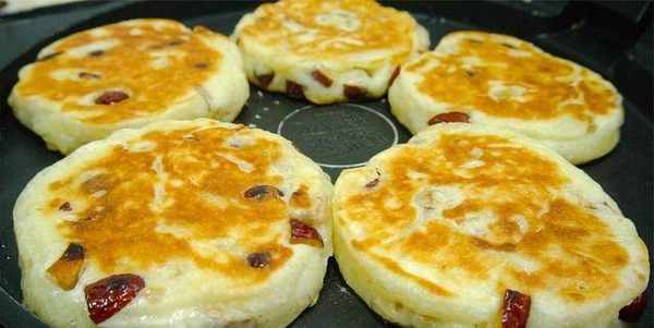 2、準備一把紅棗切丁,面糊發好瞭,把紅棗倒進來,攪拌均勻。電餅鐺預熱以後,刷一層食用油,舀一勺面糊,整理成一個圓餅狀,刷一點食用油,鎖住水分。中火先烙兩分鐘,直到餅兩面都是金黃色,就熟透瞭。山藥發面餅就做好瞭。