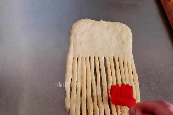 8.再用搟面杖將排氣後的小面團搟成長形面皮,接著將面皮的下端2/3切成條狀,刷油