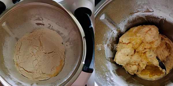 3.選揉面模式揉面3分鐘,然後加入橄欖油20克(或是軟化的黃油),再設定3分鐘揉面,成團