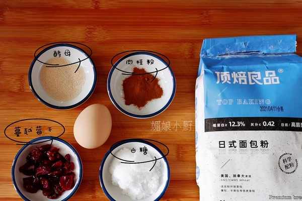食材:頂焙良品日式面包粉250克,酵母3克,白糖30克,雞蛋1個(約60克),牛奶或水135克,鹽2克,橄欖油20克,肉桂粉5克,蔓越莓幹1把,高度白酒小半碗,蜂蜜少許