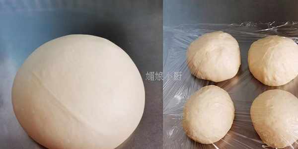 6.面團發至原始面團的2倍大,看起來非常蓬松輕盈的樣子,平均分成4份,將每個小面團滾圓,此時的面團特別有彈性,用手掌壓一壓面團便馬上回縮,蓋上保鮮膜靜置松弛10分鐘,松弛後的面團更易於整形操作