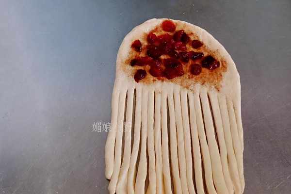 9.在上半部分先塗抹一層肉桂粉,再放上蔓越莓幹(也可用蜜豆、堅果都行)