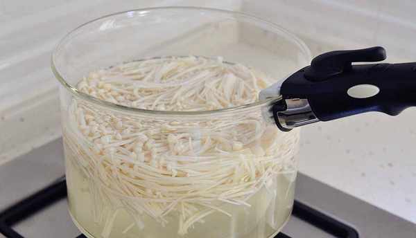 3.剛才煮粉絲的鍋裡,直接倒入切掉蒂部的金針菇,燙煮一分鐘,至都軟塌瞭也撈出過冷水。
