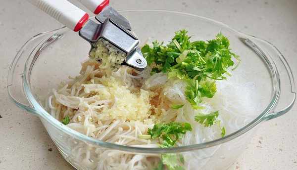 4.將焯燙好的粉絲和金針菇,都放入碗中,再加入香菜段和調味料,大蒜夾成蒜泥放進去。