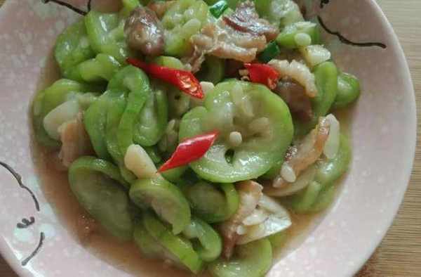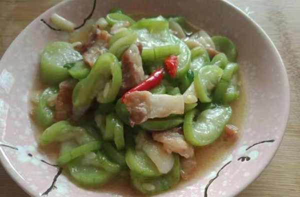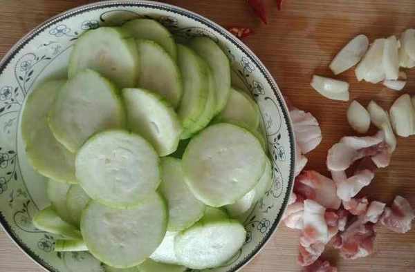 1、將我麼從市場買回來的新鮮絲瓜認真的清洗幹凈,削去外皮後切片備用,將絲瓜切片這樣在炒制的過程中絲瓜更容易熟,而且更入味。豬肉洗凈血水,切片即可,北鬥建議選用肥瘦相間的五花肉,炒出來的絲瓜更鮮香。將調味用的大蒜、辣椒洗凈後切好裝盤備用即可。