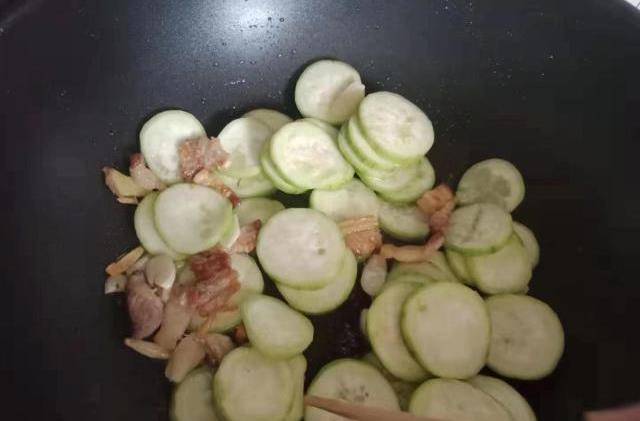 4、鍋中的豬肉被炒至變色,我們就可以加入切好的絲瓜在鍋中,可以加入適量的水,這樣更容易將絲瓜炒熟。