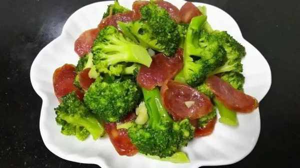西蘭花適量、臘腸適量、宴友食用油適量、鹽適量、蒜瓣適量