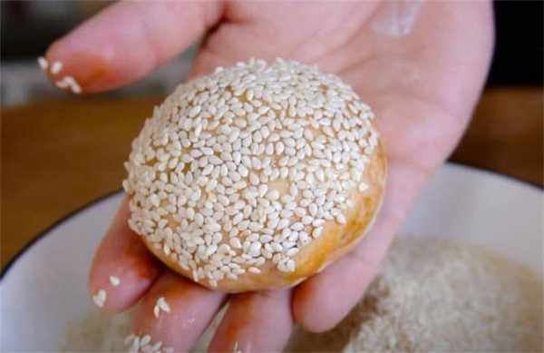10.表面刷上剛才調好的糖漿,外面裹一層白芝麻,像這樣咱們這個面劑就完全做好瞭。