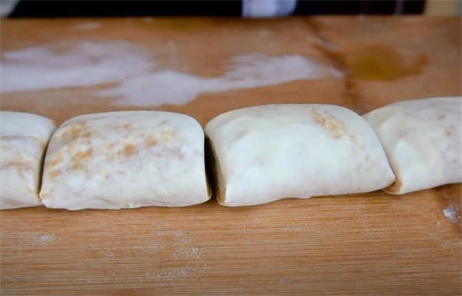 8.卷好之後從側面看看這個層次,是不是特別多,大拇指在中間向下按扁。