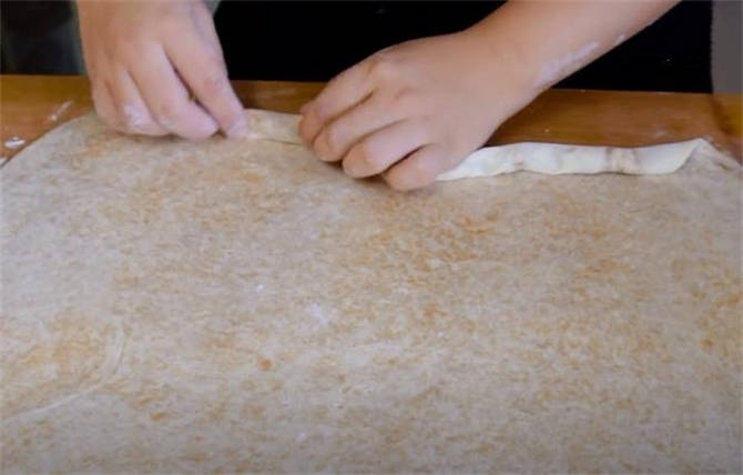 6.剛才餳好的面直接按扁,用搟面杖直接搟成一張薄的餅皮,搟好瞭把它卷起來,卷的時候邊扯邊拉伸,這樣層次會多一些。