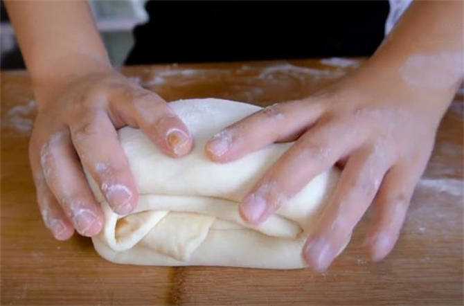 4.卷好之後向裡對折,然後再折過來,這個面團不要急著搟,咱們先封上保鮮膜餳上20分鐘,後面好操作,餳面會增加面團延展性,利於後期的操作。