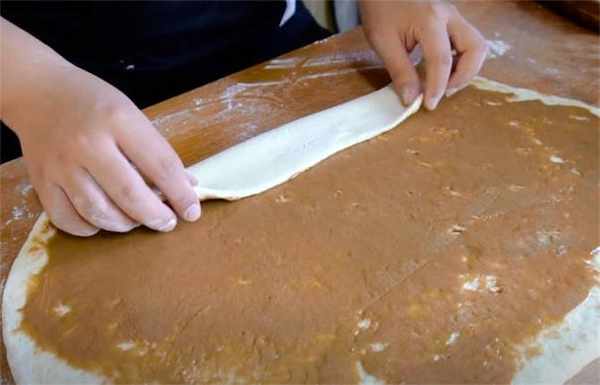 3.面差不多松弛好瞭,先少撒一些幹面粉防粘,搟成長方形的餅皮,這是咱們剛才調好的芝麻醬把它放上去,抹好之後把它卷起來。