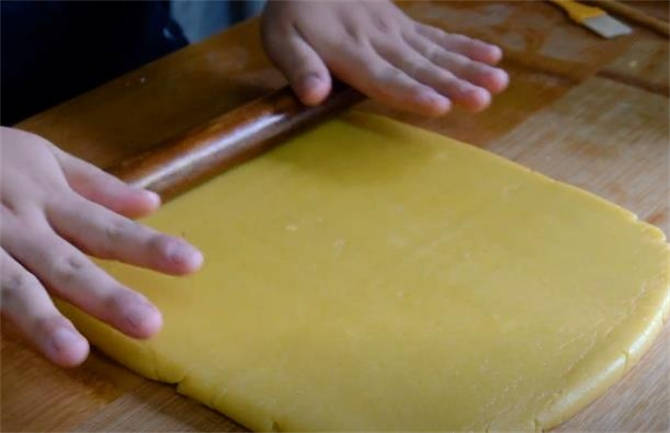 1.準備160g的玉米油,90g白糖,先把這些材料攪勻瞭,加上4g的無鋁泡打粉,3g的小蘇打,150g的玉米面,300g的低筋面粉,攪成絮狀後揉成面團,簡單的揉成團把它放在案板上,這樣好操作,然後用搟面杖把它搟大一點。