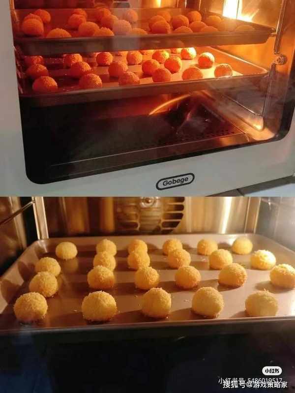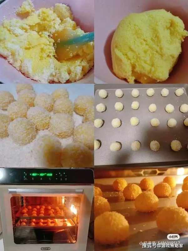 :分成12克一個搓成圓球,表面裹上椰蓉,擺入烤盤中,送入提前預熱好的烤箱高比克80S風爐功能150度18到20分鐘表面上色滿意出爐。