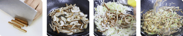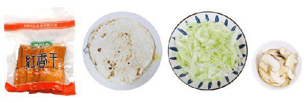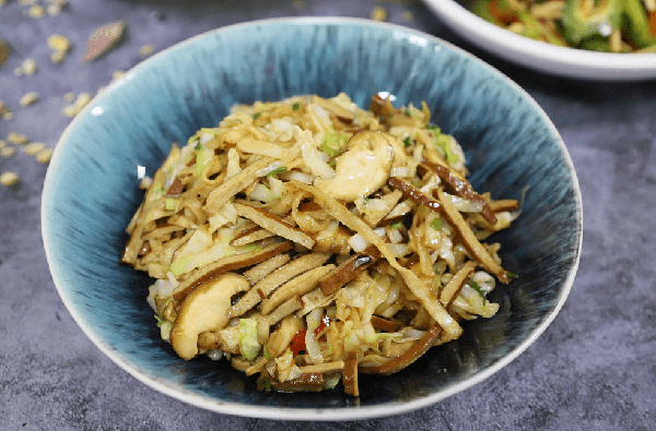 ①白茶幹先批薄片,再切細絲,焯水備用;筍切筍絲;香菇切細絲;