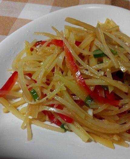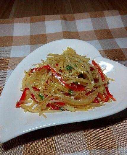 過好涼水的土豆絲撈出控水,裝在盤裡,撒上甜椒絲,蒜末,小蔥;加適量鹽,雞精,少量白糖,香醋,花椒油,香油。