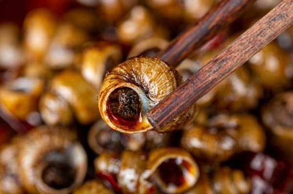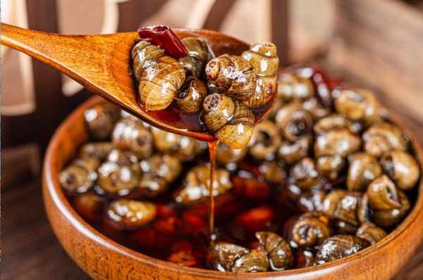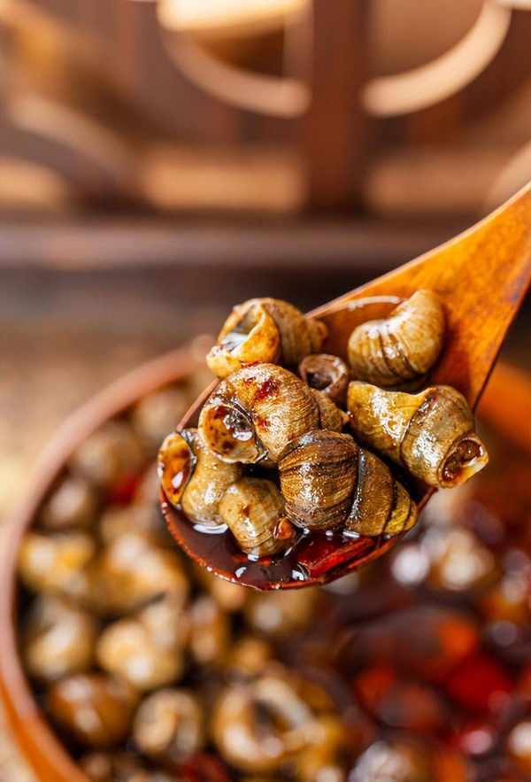 在蘇州,螺螄又被叫作“罐頭篤肉”,意思是螺螄就像罐頭一樣裝著肉。醬爆螺螄和上湯螺螄是蘇州人慣常吃法。制作醬爆螺螄,先起鍋熱油,再加入薑、蔥、辣椒一起炒香,接著倒入吐沙剪尾的螺螄翻炒,加入生抽、料酒、食鹽,最後加白糖翻炒,有條件的話還可以加入骨頭湯燜一下,更能增添鮮味。炒好的醬爆螺螄濃油赤醬,鮮香熱辣。醬爆螺螄的訣竅在於火候與翻炒時間的把握,久瞭螺肉老瞭會發韌,短瞭螺肉不熟。