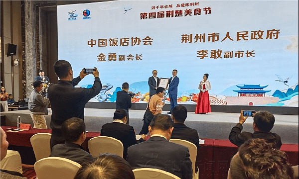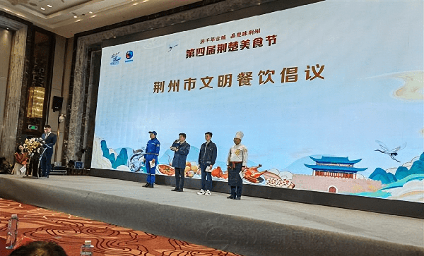 副市長李敢宣佈第四屆荊楚美食節開幕。開幕式上,荊州市被授予“楚菜地標美食城市”稱號,“宜荊荊恩城市圈”的行業代表也受邀來到現場,發表聯合宣言,共同為推進楚菜的研發創新和宣傳推介出力,荊州市商務局還專門策劃推出一款美食文創產品。