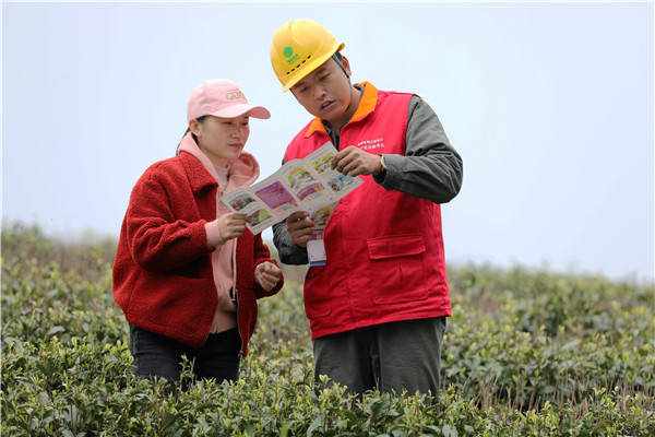 用電設備檢查完之後,黨員服務隊員們來到茶園深處,向茶農及遊客們宣講春、夏季安全用電意識。