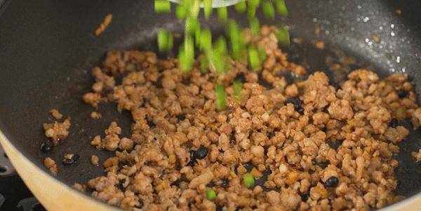 3.起鍋熱油,放入薑蒜末、豆豉爆香,加入豬肉末炒散