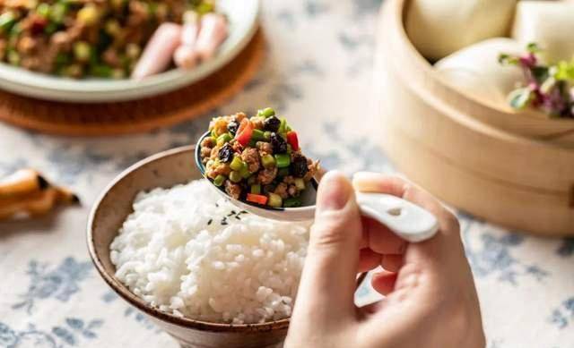 直接上勺子,脆甜的蒜薹丁、幹香的肉末、咸香的豆豉,辣椒圈也不放過,全都撈到米飯上!
