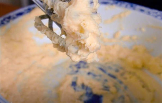 3.花生處理好瞭,咱們開始打發黃油,這是150g的黃油,倒上70g的糖粉,把這兩材料先拌勻瞭,現在黃油和糖粉已經攪好瞭,咱們用打拌器把它打發,打到有一點微微發白的程度就好瞭。