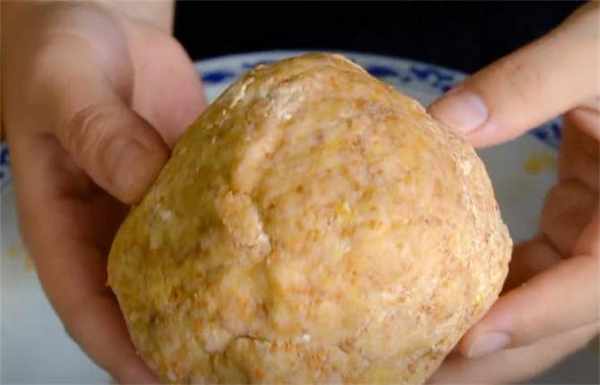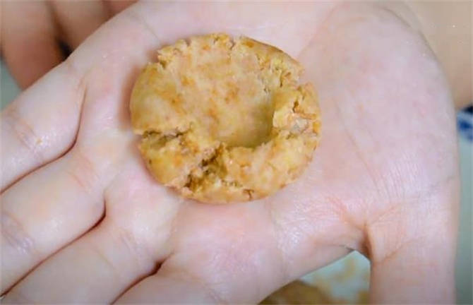 5.直接揪一小塊面劑,在掌心把它給抓勻抓圓瞭,大拇指在中間按一下,這個形狀就做好瞭。
