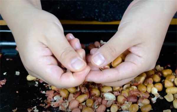 1.花生烤好之後稍微放涼,咱們把外面皮給去瞭。