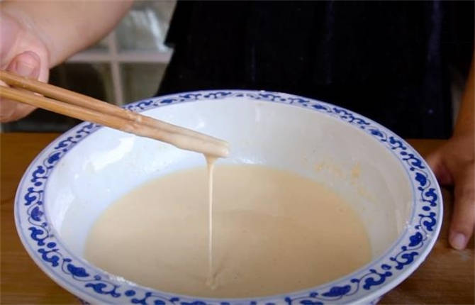 3.現在咱們調個面糊,倒上一些面粉,再倒上一些玉米淀粉,這個面粉和淀粉的比例是二比一,加一勺十三香,少放一點鹽,攪勻瞭之後再少量多次的添加清水,咱們一直攪拌成提起來筷子呈流線狀就行瞭。