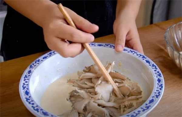 4.把蘑菇放在面糊裡面攪勻瞭。