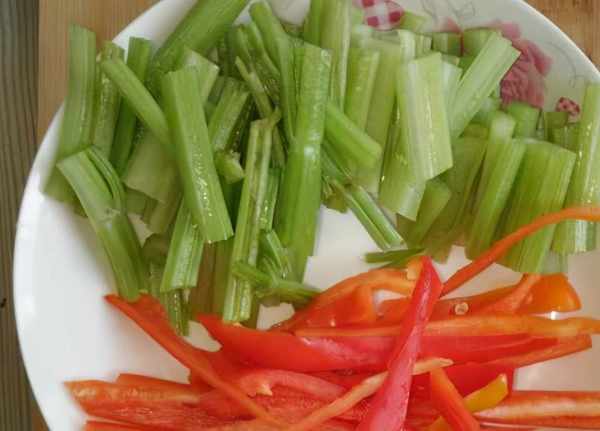 開始步驟1、西芹入水中焯一下、瀝幹水分。